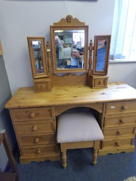 Double Pedestal Mirror Backed Pine Dressing Table with Stool