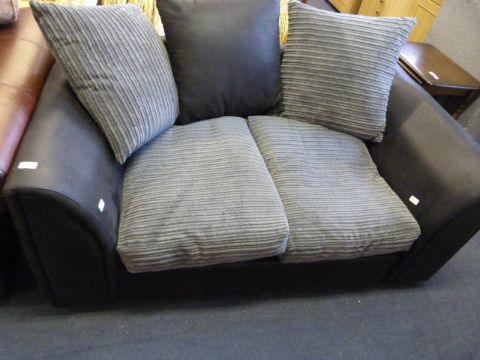 BLACK LEATHER TWO SEAT SETTEE WITH GREY CUSHIONS