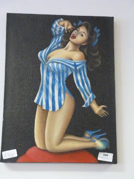 OIL ON CANVAS "GLAMOUR GIRL IN BLUE STRIPED SHIRT"