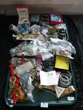 LARGE QUANTITY OF COSTUME JEWELLERY; NECKLACES, WRISTWATCHES, BANGLES, ETC.
