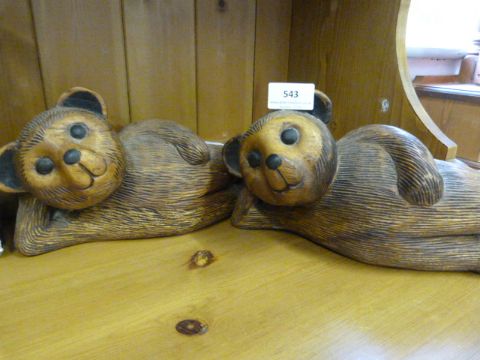 Pair of Reclining Carved Wood Teddy Bears