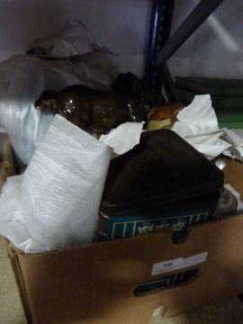 Box Containing Pottery and Brass Vases, Teapots, Shire Horse, Etc.