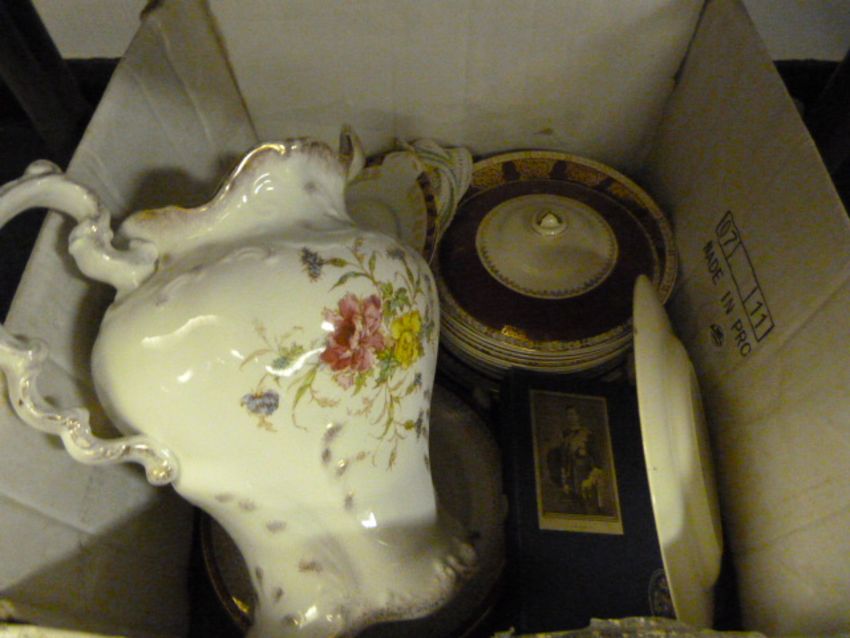 Box Containing a Large Water Jug and Dinnerware