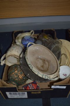 Box of Pottery, Jugs, Plated Ware, Vases, Glassware, etc.