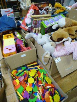 Four Boxes of Children's Toys, Soft Toys, Dolls, Abacus, etc.