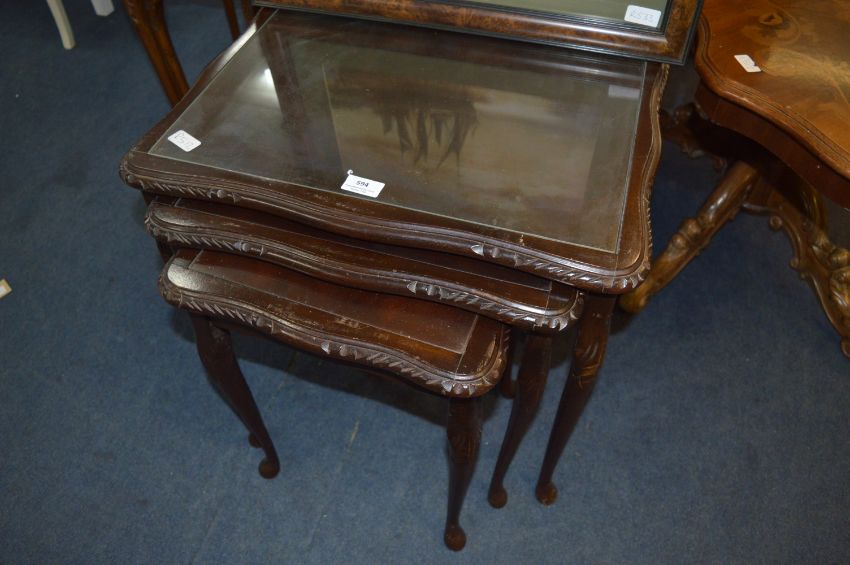 Mahogany Nest of Three Tables with Glass Inlet Tops