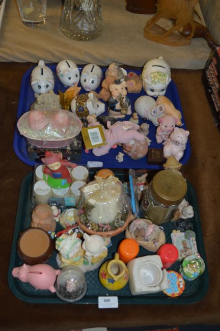 Two Trays of Ornaments Including Pigs, Candle, etc.