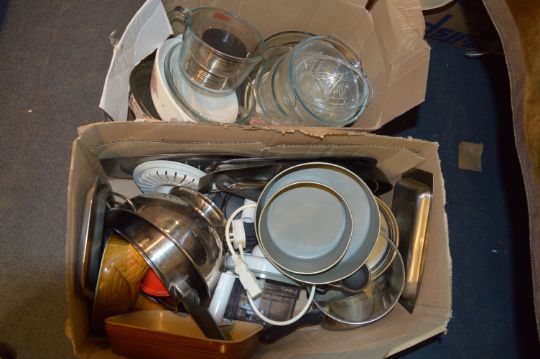 Two Boxes of Kitchenware, Pyrex, Stainless Steel Pans, Chicken Egg Holder, etc.