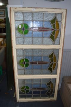 Large Three Panel Coloured Glass Lead Glazed Window Pane