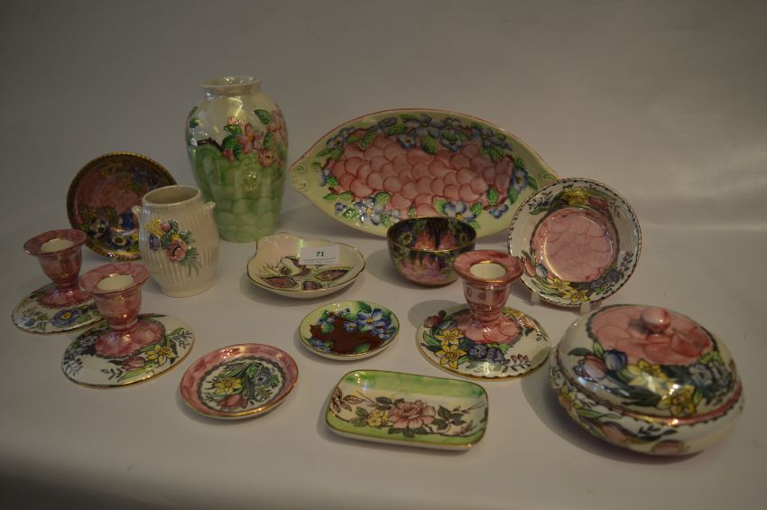 Fourteen Pieces of Assorted Maling Ware: Candle Sticks, Pin Dishes, Vase, etc.