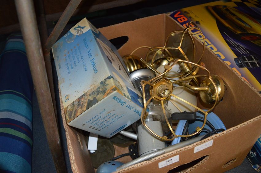 Box Containing Ceiling Lights, Oil Lamp, Anglepoise Desk Lamps and a Iron