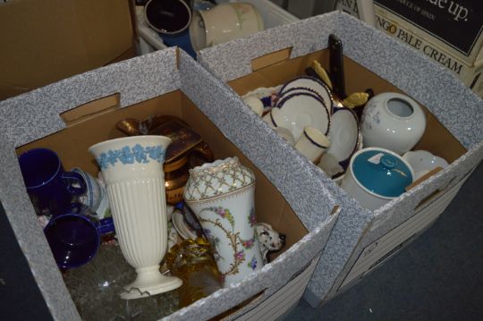Two Boxes Pottery Jugs, Vases, Glassware, Teapot, Large Bowl and Cutlery