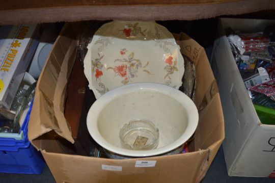 Box Lot Containing Glassware, Cake Plates, Jardiniere, etc.