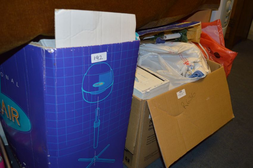 Large Box Containing Table Lamps, Headphones, Table Linen, Hair Dryer, Christmas Toys and a Chronicle Book