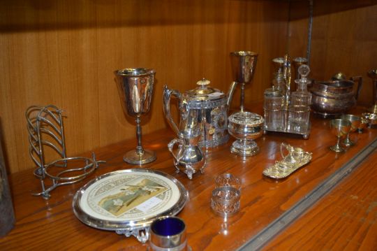 Collection of Silver Plated Ware; Teapot, Vases, Teapot Stand, Condiment Set, etc.