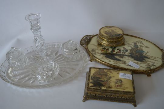 Glass Dressing Table Set, Oriental Brass Tray, Trinket Box and a Powder Box