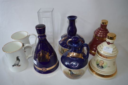 Wade Bell's and Others Whiskey Decanters and Two Pigeon Mugs