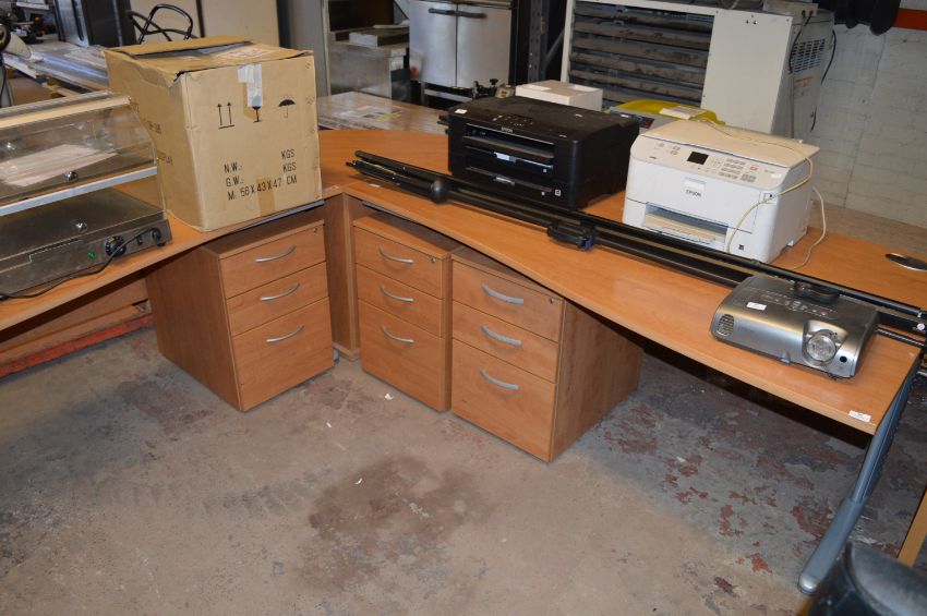 Medium Cherry Reception Unit Comprising of Two Shaped Desks, One Corner Unit and Three Drawer Pedestals