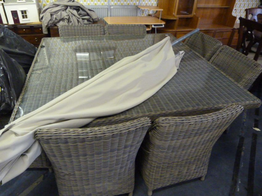 *NEPTUNE SQUARE 10 PIECE CANE GARDEN TABLE, CHAIRS AND UMBRELLA