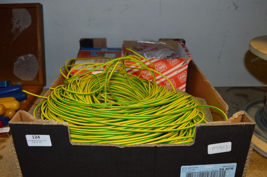 Box Containing Box Containing Earth Sleeves, MK Smoke Alarms and PIR Flood Lamp