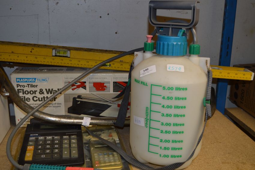 Mixed Lot Consisting of Calculators, Garden Pressure Spray, Two Spirit Levels and a Tile Cutter