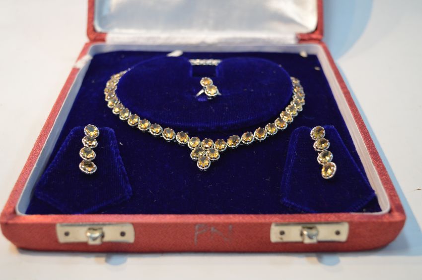 Golden Topaz and Silver Jewellery Set; Necklace, Earrings and Ring