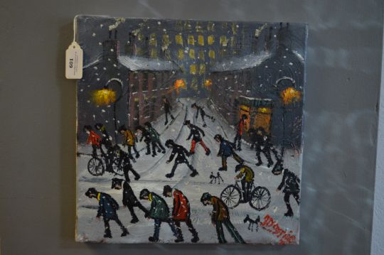 J. Downie Oil on Canvas "Leaving Work in the Snow"