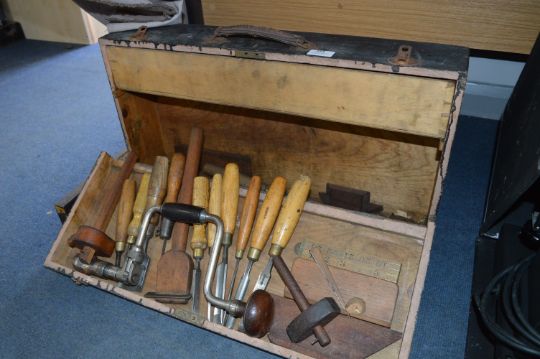 Carpenters Toolbox and Contents; Brace, Chisels, Scribe, etc.