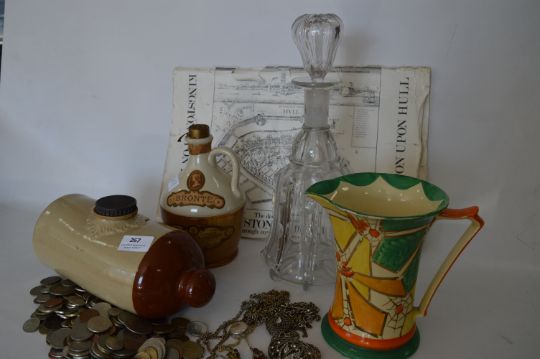 Myott Jug, Glass Decanter, Bed Warming Bottle, Costume Jewellery and a Coin Collection