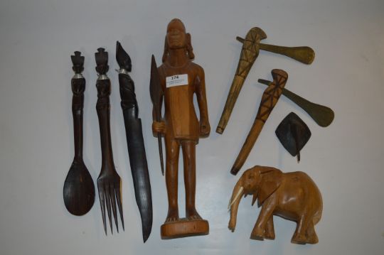 Carved African Elephant, Cutlery and Axes, etc.