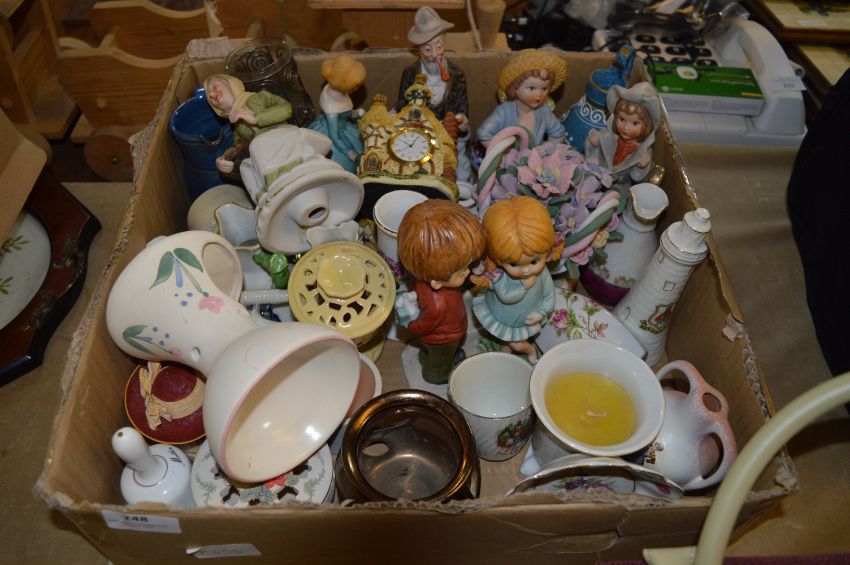 Box Lot of Pottery Figurines Small Clock, Jugs, etc.