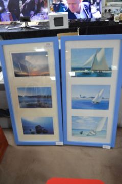 Pair of Blue Framed Prints "Coastal Scenes and Sail Boats"