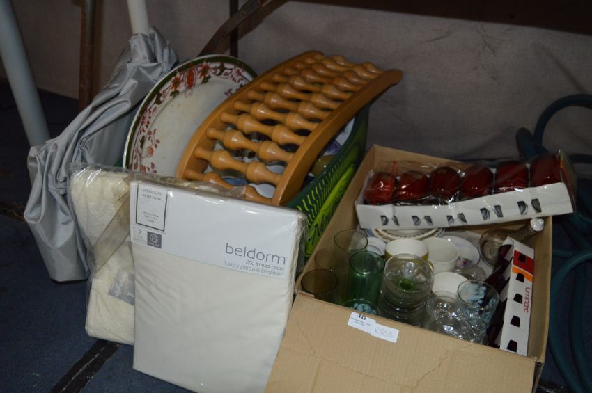 Two Boxes Containing Drinking Glassware, Mugs, Towel Set, Back Massager, Meat Plates, etc.