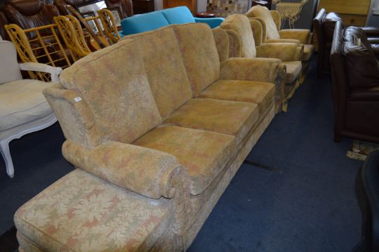 Floral Patterned Upholstered Three Piece Suite; Three Seater, Two Armchairs and Pouffe