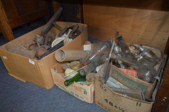 Three Boxes Containing a Large Quantity of Chemists Equipment; Bottles, Pestles, etc.