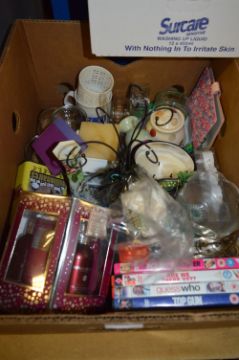 Box Lot; Drinking Glassware, Candlestick, DVDs, etc.