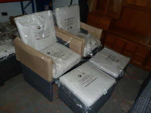 *Pair of Rattan Style Garden Chairs with Footstools and Cushions