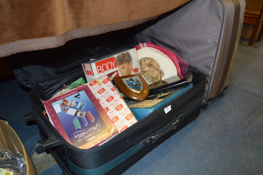 Two Wheeled Suitcase and Contents; Body Massager, Wine Goblets, Hats, Chrome Tray, Wall Shields, etc.