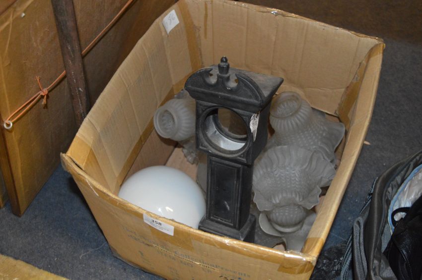 Box Containing Light Shades and Pottery Miniature Grandfather Clock Case