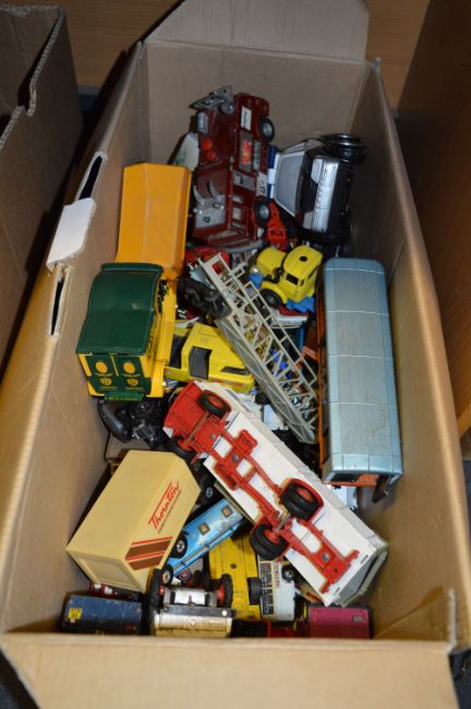 Box of Diecast Vehicles; Trucks, Fire Engines, Buses, etc.