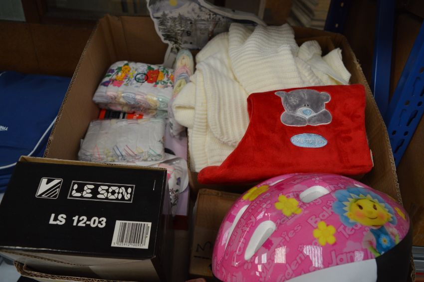 *Box of Clothing Cycle Helmets, Leeson 12V Amplifier, Maxim Car Stereo, etc.
