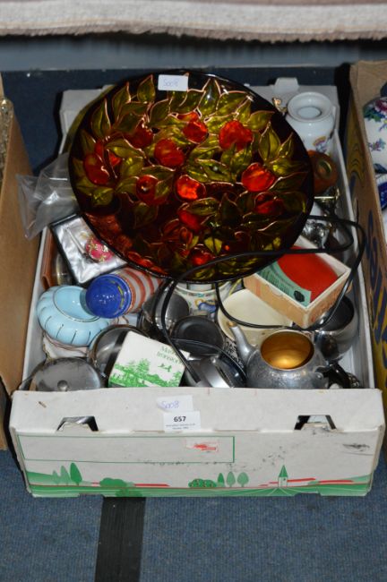 Box Containing Chrome Teaware, Brass Dish, Ornaments, Jugs, etc.