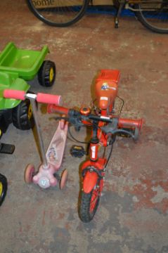 Fire Chief Child Bicycle with Stabilisers, and a Pink Three Wheel Scooter
