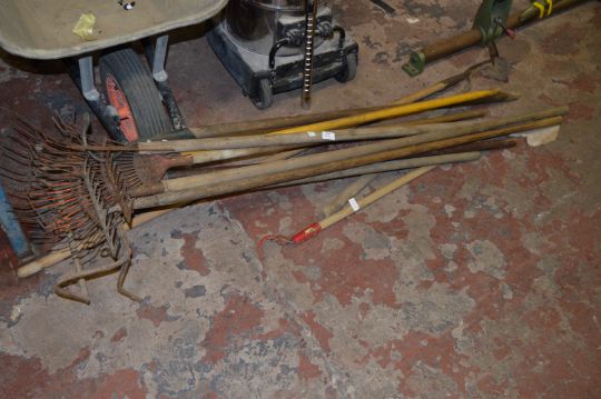 Eleven Assorted Gardening Tools ; Rakes, Hoses, etc.