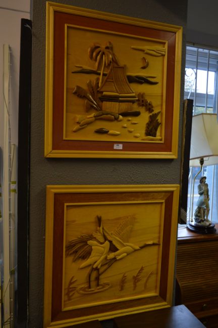 Pair of Japanese Carved Relief Pictures "Herons" and "House"