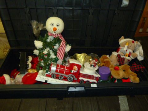 Large Plastic Storage Bin and Contents of Christmas Decorations