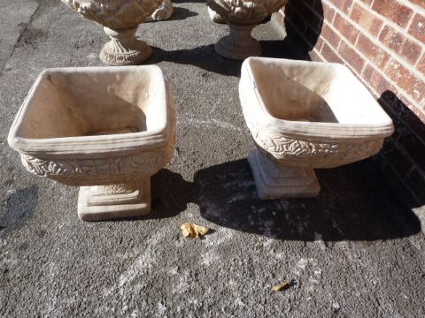 Pair of Reconstituted Limestone Garden Urns with Rose Decoration