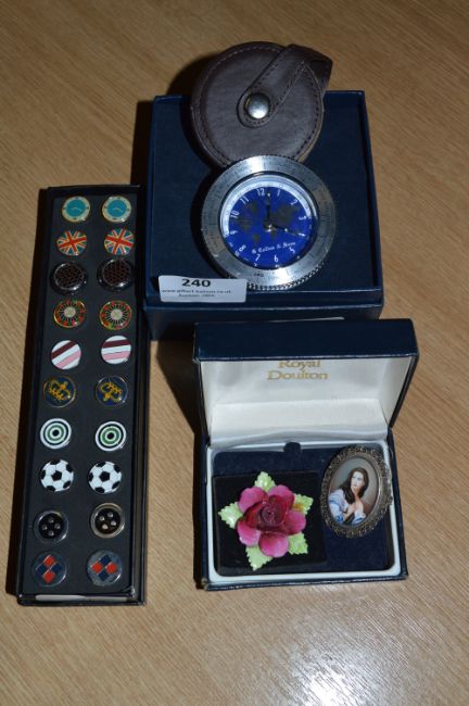 Collins & Sons Travel Clock, Cufflinks Sets and Two Brooches