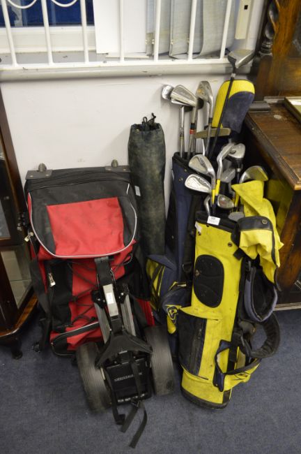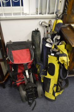 Two Golf Bags, Trolley and Wheeled Case with Dunlop and Other Golf Clubs
