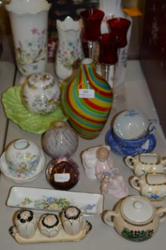Table Lot of Aynsley Pottery Vases, Glassware, Paperweight, Condiment Set, etc.